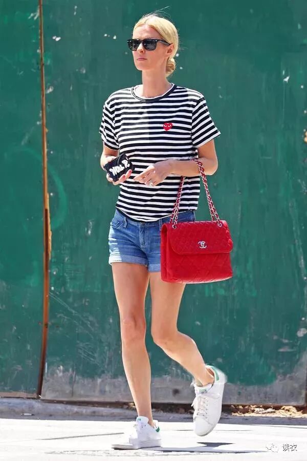 黑白条纹T恤和蓝色牛仔短裤每个女孩都能穿,但显得时尚的重点在细节处。CdG Play系列最标志性的眼睛爱心。