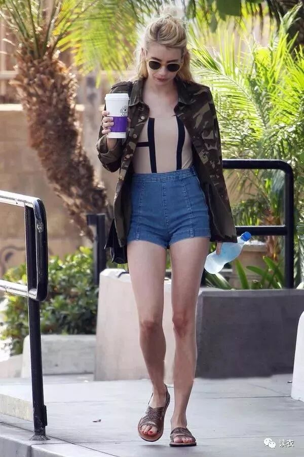 军旅风格的迷彩衬衫可以当外套穿,内搭衫也要塞进高腰热裤里哦,中性利落的打扮十分帅气潇洒,显高瘦效果也一流。