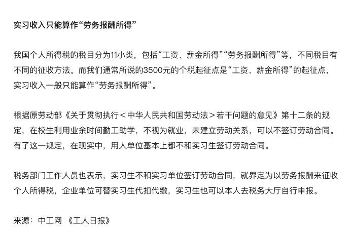 Q:实习工资按照劳务报酬扣税(20%的税率),本来就不高的工资更少的可怜,这样做合规吗?