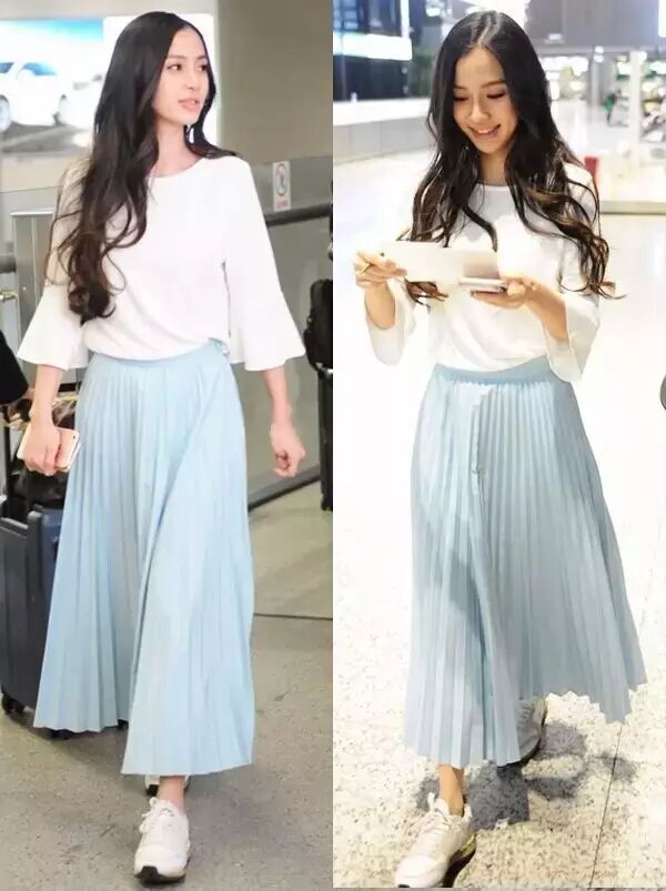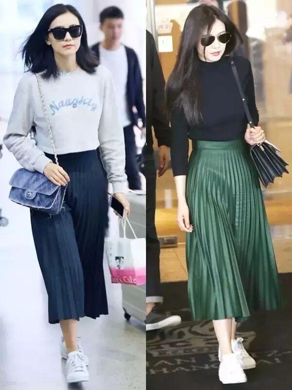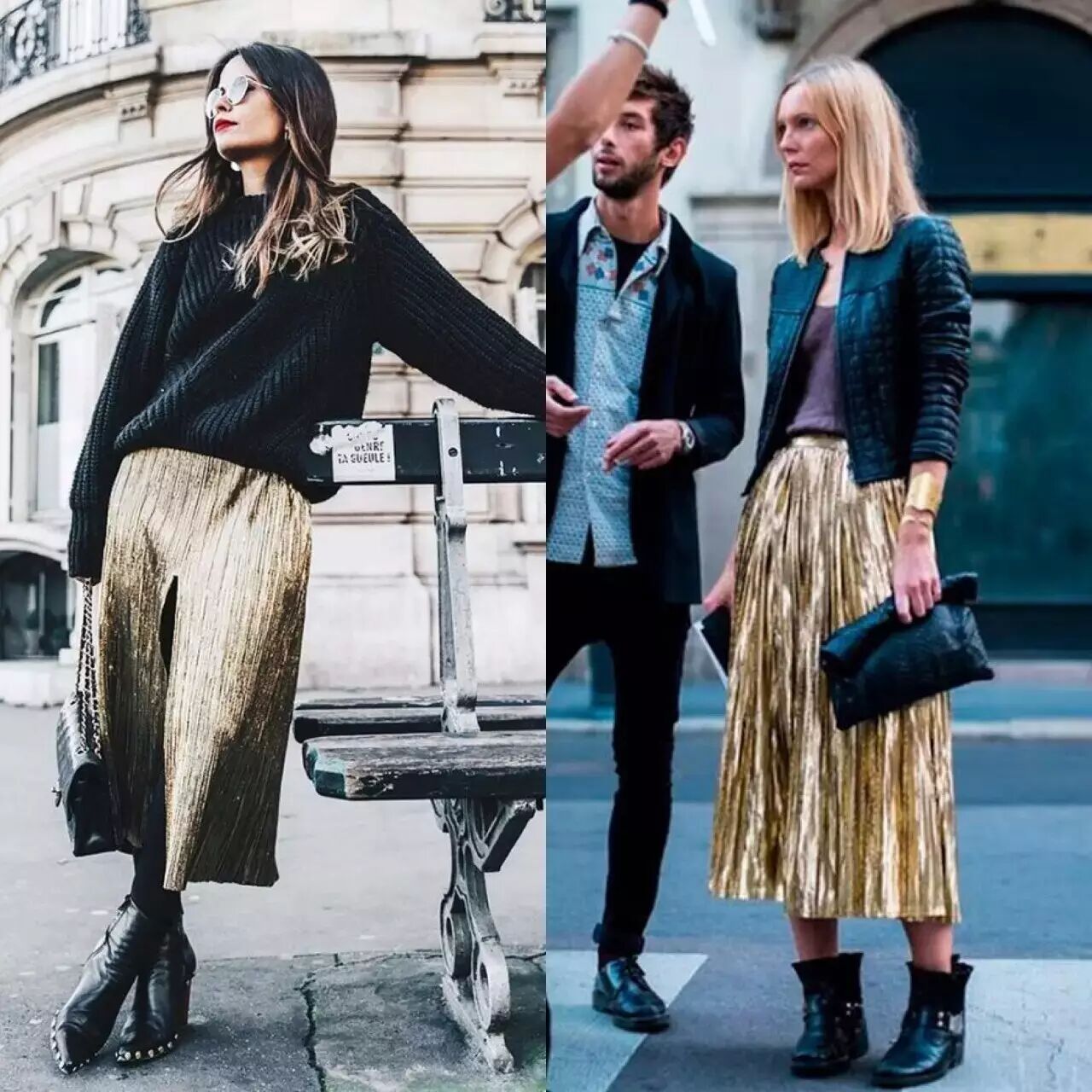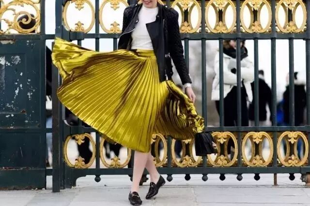 说到当下的百褶裙的时尚元素,不得不提便是金属颜色运用。说到金色,一般的搭配达人都极力趋之,一是金属颜色挑人、难驾驭;二来,往往考验到自身的搭配能力。