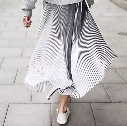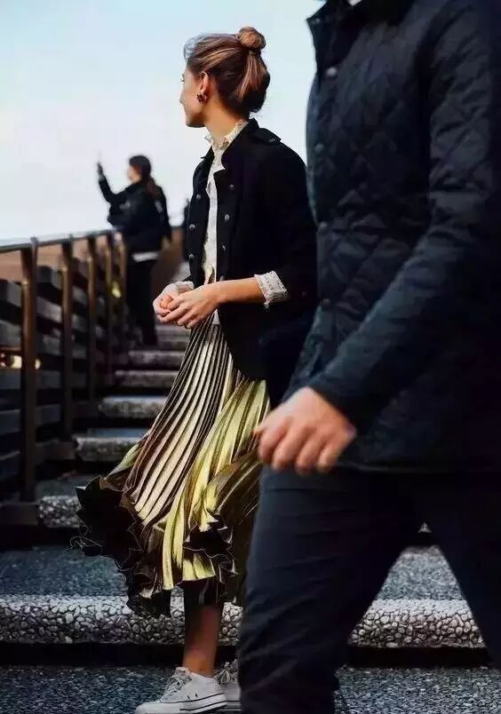 运用黑、白和大地色,能够帮你巧搭金属色的百褶裙。当打算穿搭金属色的百褶裙时,不妨上身以黑色为主,下身穿着上百褶裙。这样搭配起来,可凸显金属色的百褶裙的颜色和质感!