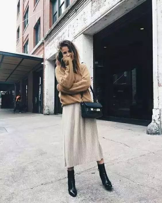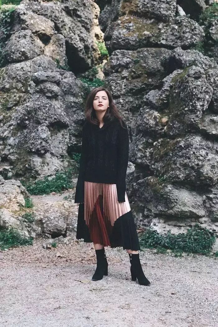 无论大毛衣还是修身毛衣,都是女生冬天穿搭的优质单品。当然,毛衣也可以很好地与百褶裙成为你出门约会的搭配组合,尤其适合休闲风的搭配。宽松的高领粗线毛衣搭配细腻的毛料百褶裙,休闲带点俏皮,却不失温度。修身的单色精纺毛衣搭上丝绸质感的百褶裙,优雅中带点书卷味。
