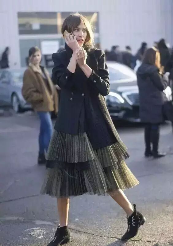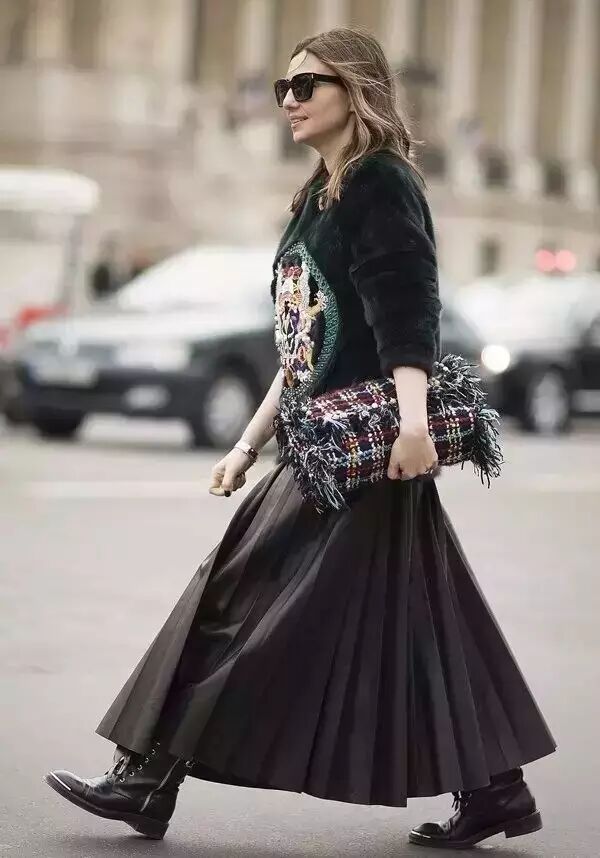 百褶裙款式的挑选也很考究。在性冷淡风 normcore 的影响下,无论在百褶裙材料、颜色和设计上都推荐选择冷色调、单色的中长款式。不仅可以成为你衣柜秋冬的百搭下装,而且提升了秋冬整体的时尚感。