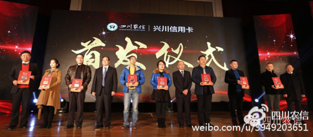 会上,在各界人士的见证下,四川农信向先行推出信用卡的三家农商行九位客户代表发放了兴川信用卡。