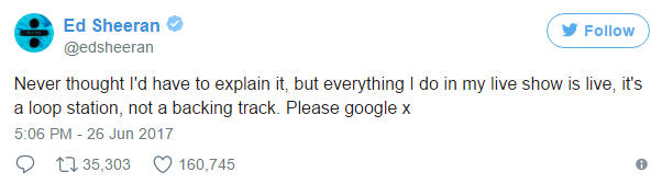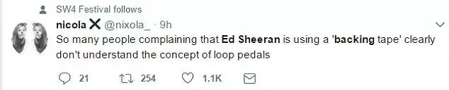 「很明显那些说 Ed Sheeran 用背景伴奏带的人根本不知道 Loop Pedal 是什么。」