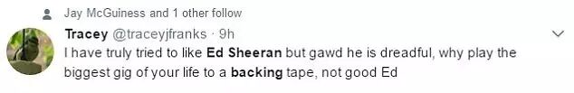 「我努力试着去喜欢 Ed Sheeran(的表演),但这实在是糟透了,你怎么能在生涯最大的舞台上用背景音来表演?」