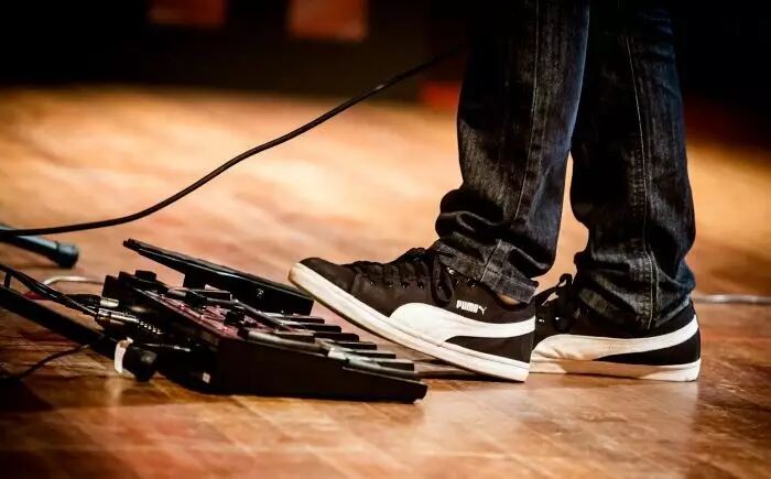 这里就需要科普一下他的「一人乐队」究竟是怎么回事以及他说的 Loop Station 究竟是什么东西了。大家都知道 Ed Sheeran 的演出只包含三个要素:他本人、吉他以及一块踏板,而很多粉丝并不知道「这块踏板」,即 Loop Station(Loop Pedal)的重要作用,以为它只是一个辅助角色。但事实上这块踏板就是 Ed Sheeran 的整支伴奏乐队和所有配唱,重要性不言而喻。复杂的就不解释了,简单来说 Loop Station 最重要的功能就是实时录制乐手的现场表演(包括人声)并根据乐手的操控进行循环播放,通过这样的方式哪怕只有一个人也可以在现场表演中为一首歌曲添加极为丰富的层次。也许这样说你还是没有什么概念,所以不妨来看一段视频,相信就会比较清楚了。