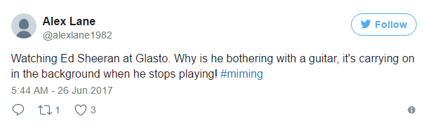也许全世界都知道 Ed Sheeran 有「一人乐队」的称号,但并不是每个去到 Glastonbury 现场的人都能够接受「全世界最好的音乐节上没有现场乐队」这件事,按照一些粉丝的说法,他们对于去现场观看「卡拉OK」很不满意。看看他们在 Twitter 上说了些什么: