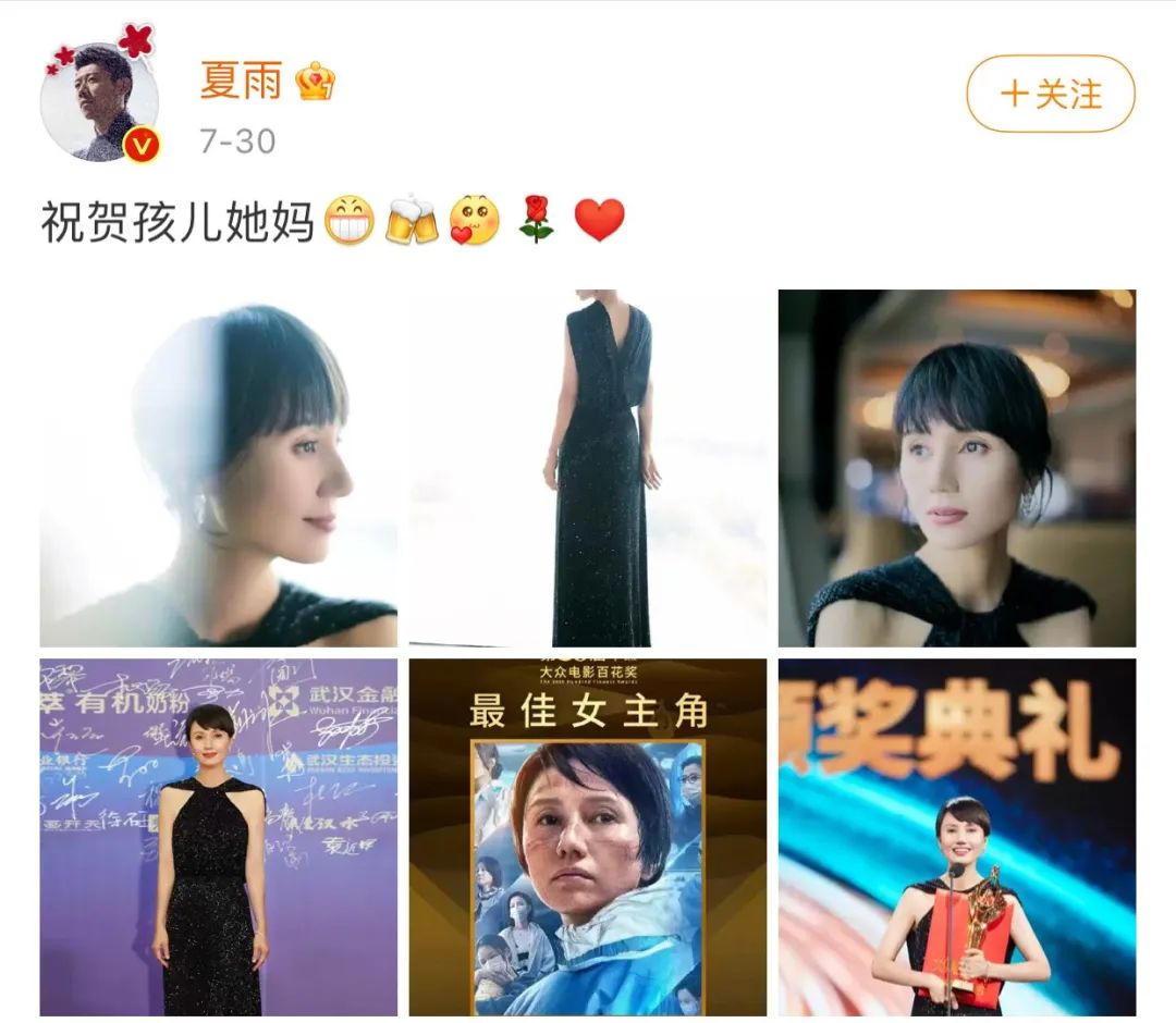 获奖的袁泉还是云淡风轻,夏雨却没藏住激动,微博晒出老婆照片:「祝贺孩儿她妈!」