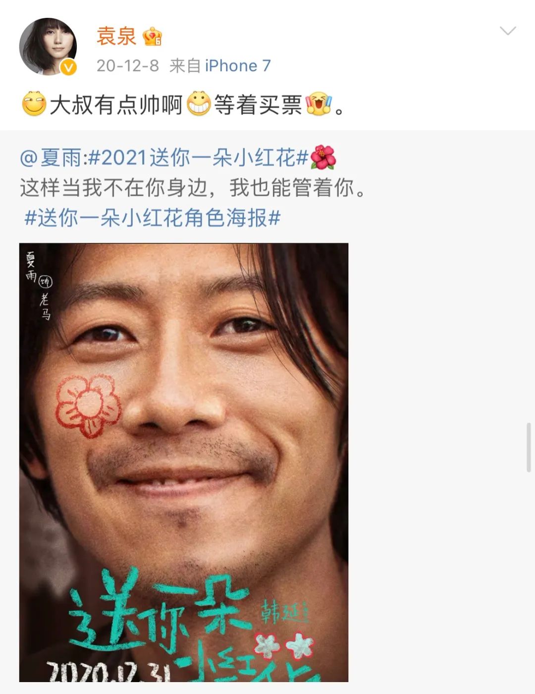 袁泉也在微博上替老公宣传了电影,「大叔有点帅啊,等着买票。」