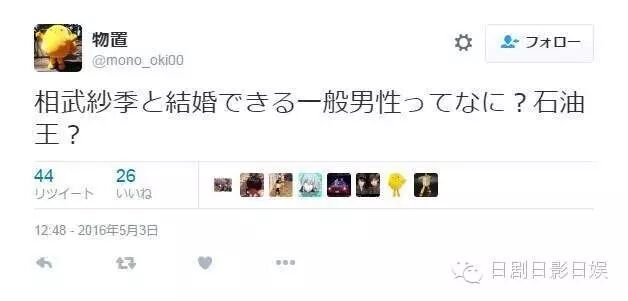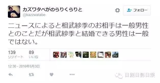 「新闻说相武纱季结婚的对象是一般男性,但能和相武纱季结婚的男性就已经很不一般了。」