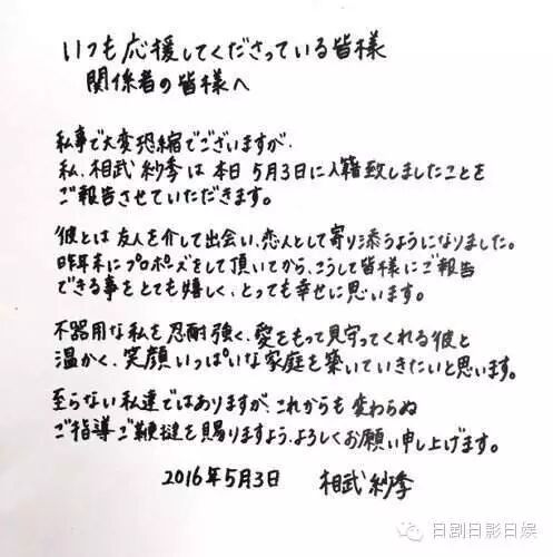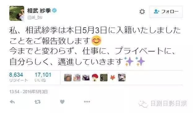 而相武纱季也在今天的结婚报导后更新推特表示之后于公于私都将照着自己的步伐继续前进,看来她应该是还不会因为成为人妻而淡出的啦!