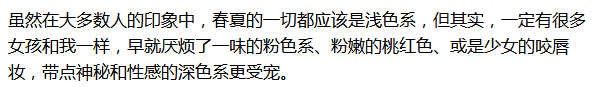 下面我们来说说在春夏也受宠的几种深色系唇色▼