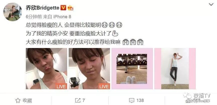 现在的女孩健身有不仅仅是为了瘦身,还有的是为了瘦脸,6月29日,乔欣就在微博上晒出一组健身自拍,并配文表示:“总觉得脸瘦的人 会显得比较聪明,为了我的精英小安 要重拾瘦脸大计了,大家有什么瘦脸的好方法可以推荐给我嘛 ”。乔欣相信大家不会太陌生,在《欢乐颂》中饰演乖乖女儿“关雎尔”而走红,现在也算是圈内小有名气的小花旦了。