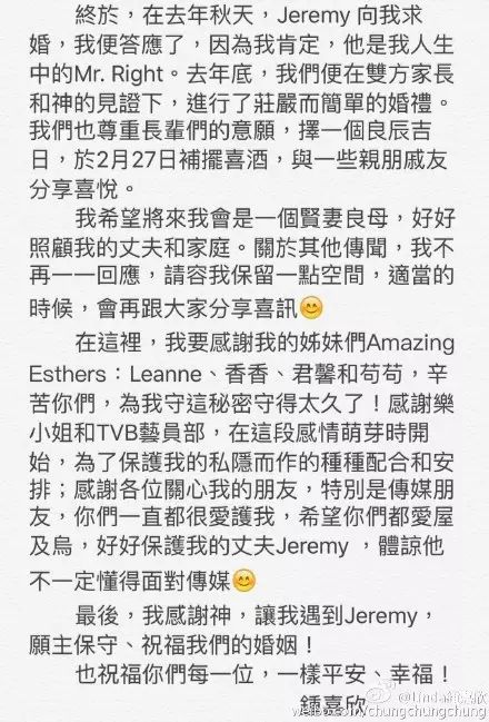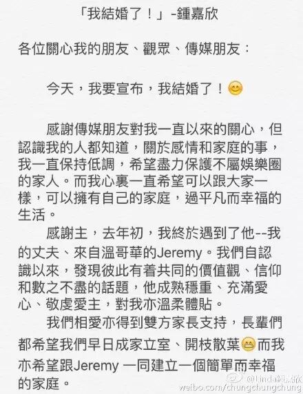 钟嘉欣在微博宣布喜讯