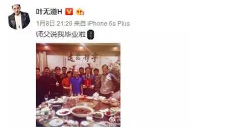 叶无道自从拜了“元德”老师为师之后,参加了众多电影的拍摄,并且也学到了很多的东西,还认识了很多的师兄师哥受益匪浅!就在昨天叶无道在微博曝出,自己的师傅-元德告诉自己说“你已经毕业啦”!叶无道出师了,可以独挡一面拉!随后与师傅还有众多师兄弟一起进行了拍照!期待叶无道以后在电影道路上一路长虹。