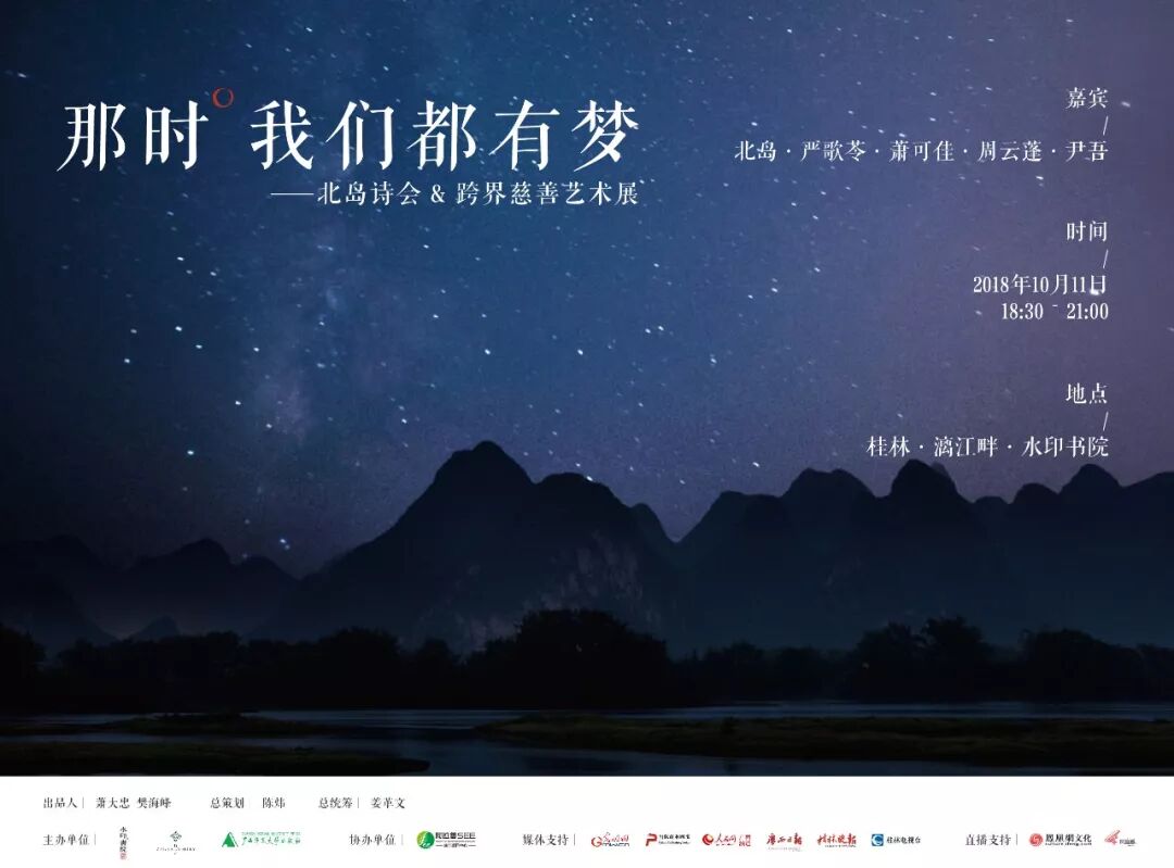 10月11日,我们与水印书院、斑马谷文化一起,特邀著名诗人北岛,作家严歌苓,书法家萧可佳,音乐人周云蓬、尹吾等人,相会桂林。在漓江畔、山水间、星空下,重温那个文学年代,诗歌年代的旧梦。注意:目前,活动报名即将截止,仅剩20个名额,先报名者先得。