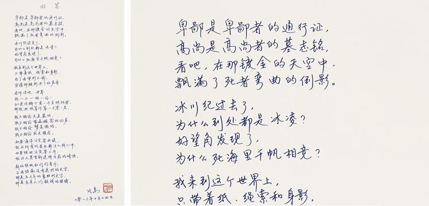 原名赵振开,1949年生于北京,1978年和朋友在北京创办文学杂志《今天》。北岛是今天诗派的重要代表,他知名的诗歌如《回答》《一切》《宣告》《结局或开始》等,曾经震撼了无数国人。自1987年起,在欧美及香港多所大学教书或任驻校作家,其作品被译成30种文字,曾获瑞典笔会文学奖、美国古根汉奖、马其顿斯特鲁加国际诗歌节最高荣誉金花环奖等,获选美国艺术文学院终身荣誉院士。2009年创办全球最具影响力的国际诗歌节——香港国际诗歌之夜,2018年创建香港诗歌节基金会。