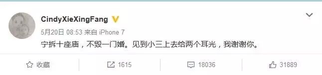 当然当上帝给你关上一扇门的时候,必定会给你开一扇窗。在放狗粮的时候,必然也会加块骨头的。就在5.20当天谢杏芳发了一篇微博疑似是在手撕小三。当初林丹出轨事件爆发之后,谢杏芳用“敢于担当”、“风雨同舟”、“感谢关心”这些措辞来盖棺定论,如今又突然撕小三。这中间的一段心路历程也是不得而知啊!不过为什么要打小三两个耳光,发生这种事不应该是渣男和小三各打一个耳光。毕竟出轨的借口不都是真爱至上么,真爱的话就要耳光分你一半啊!现在想来,与其做这样子的比翼鸟,还不如默默当只单身狗呢。