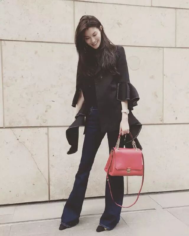 超模何穗大长腿穿这条微喇牛仔裤驾驭的得心应手,微喇牛仔裤搭喇叭袖的黑色上衣,脚踩拼色粗跟鞋,很时髦凸显大长腿的优势。