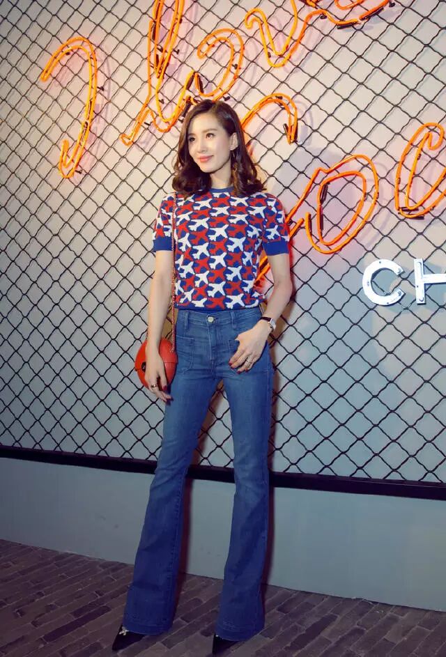 周冬雨这个小女生型,穿黑色立领衬衫搭高腰喇叭牛仔裤,这样显得腿特别修长,脚踩多高的鞋子都会误以为是腿长。