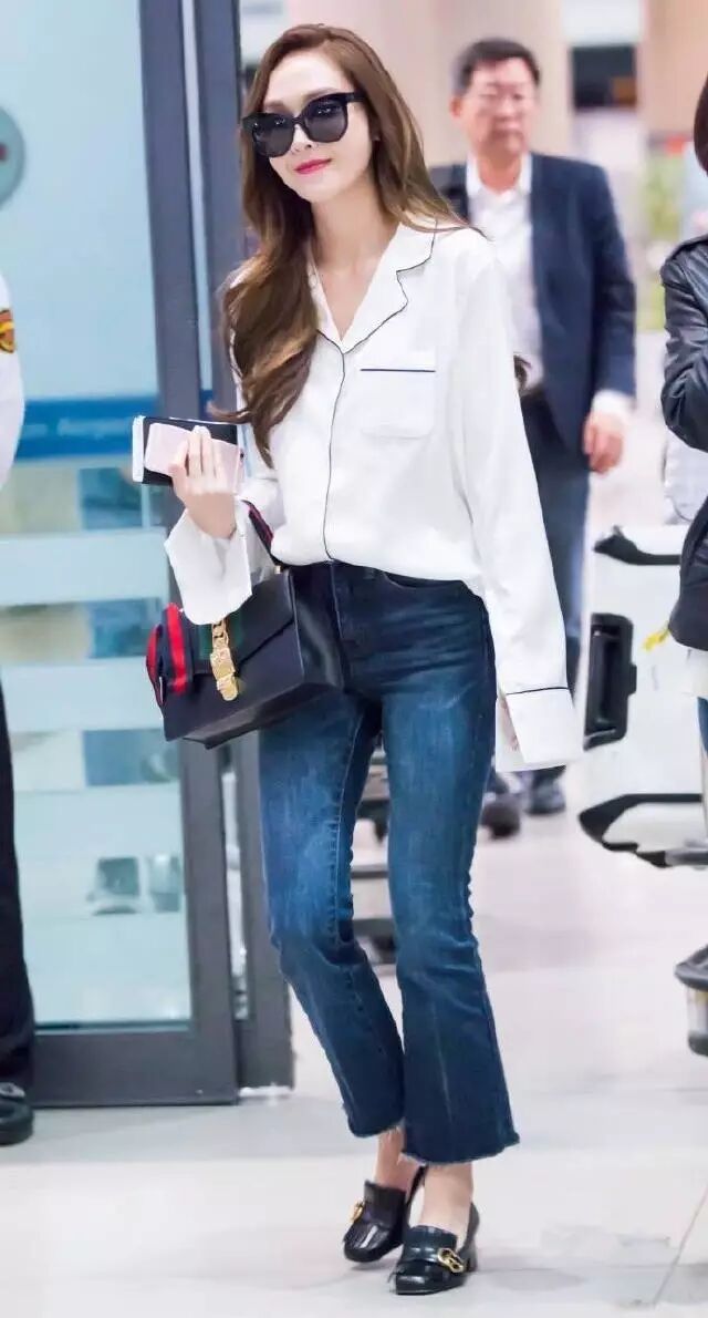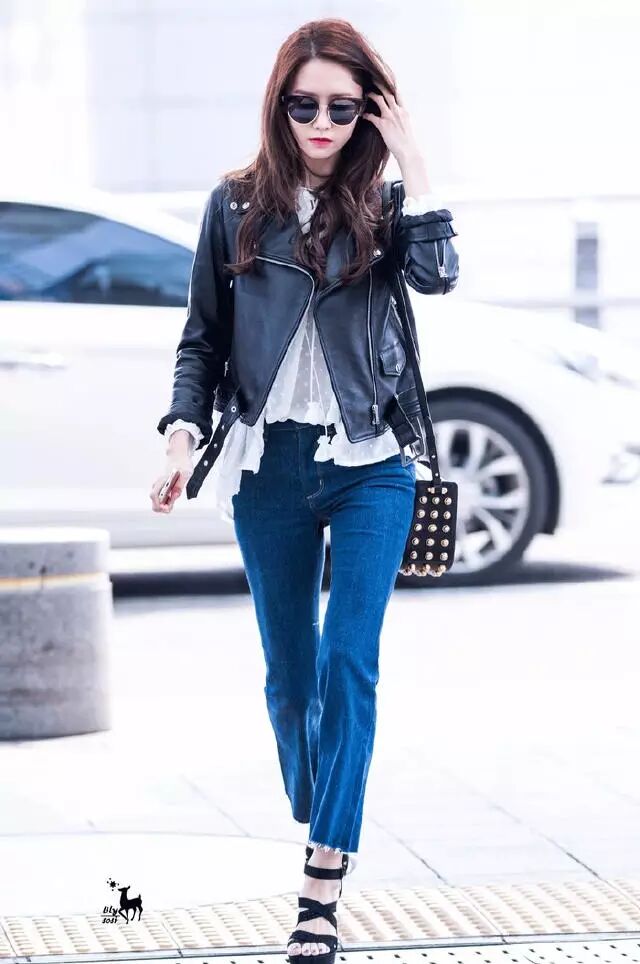 林允儿也穿这条微喇裤,她很有小心机呢,选择九分牛仔裤搭白色雪纺衫和小皮衣,帅气又时髦。