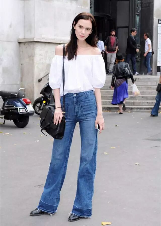 一字肩白上衣搭牛仔拼接微喇裤,脚踩黑色皮靴,很时尚复古。