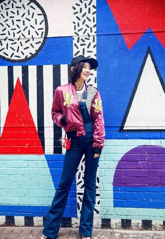 袁姗姗这个穿搭高手选择微喇牛仔背带裤,搭条纹上衣和刺绣棒球衫,超前卫时髦。