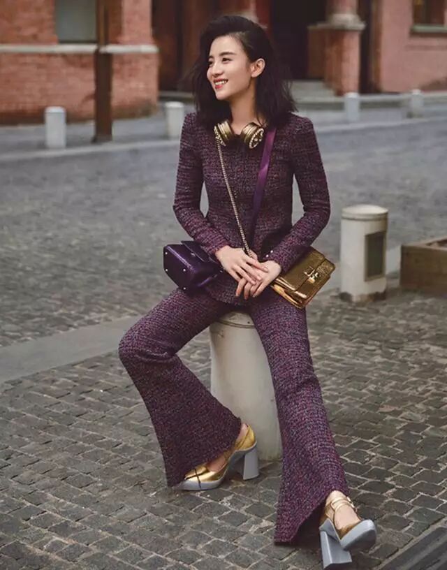 宋佳选择套装穿搭,微喇的款式复古又时髦,踩粗跟厚底鞋,挎链条小包,极具潮味。