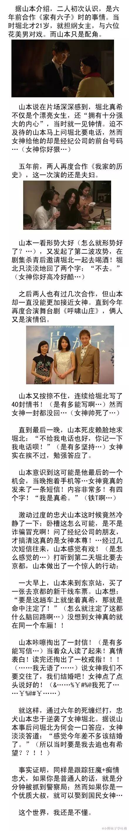 【堀北真希】被大叔六年写40封情书而感动.. 轻松日语 日韩女星 2015-08-25 17:46:53 1227 创作不易,用心坚持,欢迎请BaGua喝几杯爱心咖啡!打赏并支持本文 打赏并删除本文 首先,我们先看下堀北真希美艳的照片吧~~记得第一次看到她是在校内,第一眼就感动哭了。世界上怎么有长得这么好看的人呢。。看到这个大叔时,我崩溃了。。怎么长介个样纸,我的女神你到底要怎样。。快把宁泽涛地址私我啊啊啊。。【日艺】08/24:堀北真希和山本耕史闪婚震撼日本,24日山本在富士综艺节目中现身,大谈他和堀北之间的过去。他是在23日接受主播笠井信辅的直击访问作录影演出,说明他是在2009年和堀北初共演《我家的男子》时,对堀北一见倾心,然而当时只得到她事务所的电话。之後二人在日剧《我家的历史》再度合作,二人扮演夫妻,他以为是黄金机会就邀请她去吃饭,结果又被拒绝。6年来山本一直单恋着堀北,直到今年二人在舞台剧《咆哮山庄》共演恋人,在期间发动约40封的书信攻势,内容包括「今日的状态如何?」等日常内容,然而堀北却完全没有回覆,直到演完庆功时山本再问堀北拿联络方法,但她仍然不给,只好把自己的联络方式给她。本来觉得这段单恋就此终结,不料这夜堀北利用软件LINE和他联络,开始了二人的关系。山本表示让他鼓起勇他追求堀北,是有次他知道堀北会去京都的时候,直觉她会乘新干线,於是自己也乘上去碰碰运气,结果真的遇上她,觉得这是奇迹及命运,於是当下就拿出准备好的戒指求婚。他同时表示二人并未正式交往,但已经谈及结婚,对她来说现在是结婚的时机,是非常重要的事,故此没有交往就决定结婚。而访问他的笠井也以「原来交往时间为零」来回应。山本其实是圈中的隐性花花公子,多次和共演的女优传出绯闻,有共演者杀手之称。关系者表示他的性格是对在意的人非常好,对於年轻女性来说他就像温柔的大哥哥。然而他最近数年都没有女朋友,在大家以为他没有结婚的想法时突然出现这消息,让大家都非常惊讶。日本网民在祝福他们之余,有人表示对於山本坚持6年的单恋非常有毅力十分欣赏,但也有说觉得他似跟踪狂。同时他们定情之作《咆哮山庄》因为充满话题性,现在已经成为各大电视台争夺播出的对象,而山本接受富士的访问,也代表富士在竞争之中取得领先位置。 创作不易,用心坚持,欢迎请BaGua喝几杯爱心咖啡!打赏并支持本文 打赏并删除本文 感谢您的支持鼓励,我会继续努力的!文章地址:用户邮箱:打赏金额:USDT 请输入数字点击”去打赏“,即可进行打赏支持本文章哦 堀北真希 About the Author 轻松日语 功能介绍:专注日本语研究,提供最有价值的自学资料以及日本的留学、旅游、购物资讯. 官方认证:洛阳麦萌网络科技有限公司 Related Posts 2018年5月夏季最火日剧推荐 2018-05-19 06:00:19 范冰冰在东京电影节的造型,连李晨也吓了一跳! 2016-04-03 22:59:58 小栗旬、山下智久…盘点日本明星们的兄弟姐妹 2015-11-19 10:02:32 【堀北真希】被大叔六年写40封情书而感动.. 2015-08-25 17:46:53 小田切让与香椎由宇1岁次子去世 2015-04-25 21:51:41 发表评论