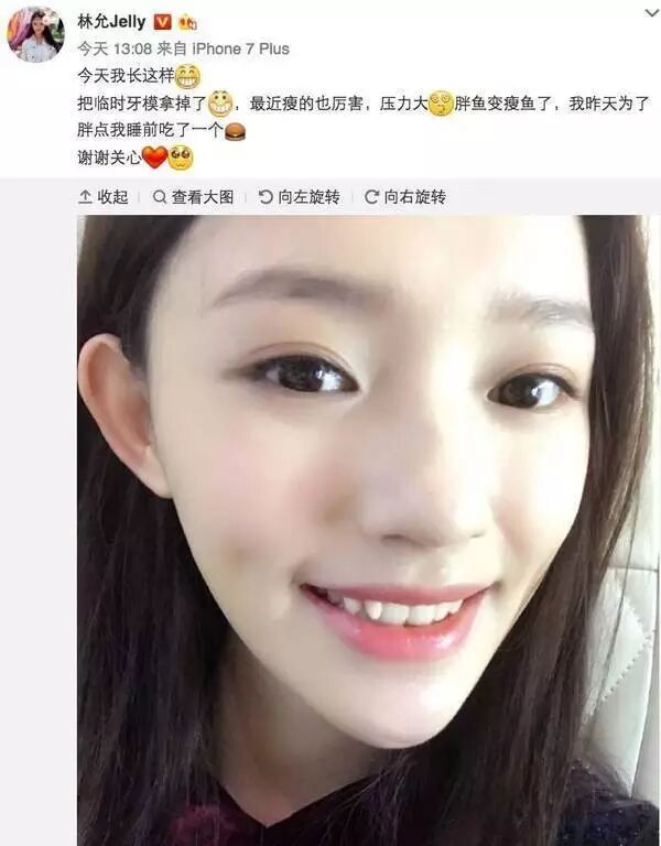 事后林允也第一时间在微博上澄清到,只是因为戴了牙模的缘故,还配了一张取掉牙模的自拍。