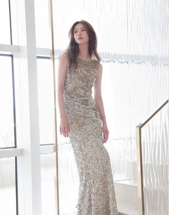 这条亮片裙金银相间的颜色展现出恰到好处的华丽,金色代表贵气、张扬,而银色又用清冷感与金色进行平衡,避免大面积的金色显得俗气。无袖版型露出两条纤细的手臂,大圆领设计修饰颈部,展现修长颈部。曳地长裙使整个造型呈现端庄典雅的感觉,又带有一丝清冷。配饰的搭配比较简洁,低调的耳饰与细金手镯呈现不张扬的高贵,清冷优雅感更强。