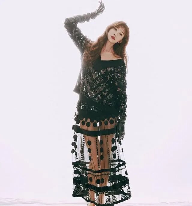 黑色上衣用部分亮片点缀增加亮点,使黑色上衣看起来更具设计感,闪亮吸睛又不会过于浮夸,可谓是恰到好处。大V领露出锁骨,显出纤细的身材优势,也能修饰颈部线条,更显脸小。下半身的全透明薄纱裙设计增添几分轻盈感,凸显纤长美腿的的同时,展现出强烈的艺术审美。大波点与小波点多层次的横竖排列,使得整个造型更具跳跃感,更显灵动独特。
