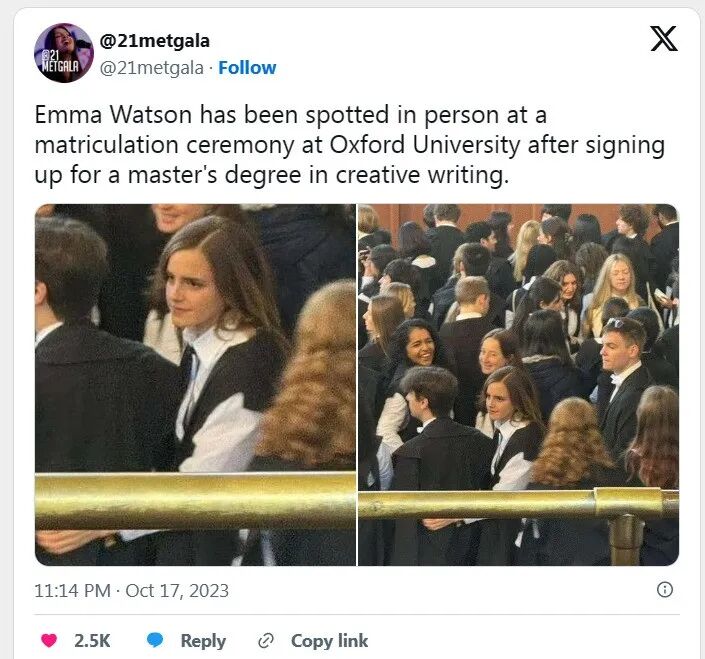 最近,她又有了新的目标!Emma Watson 决定继续深造,进入英国牛津大学攻读创意写作硕士学位( MSt creative writing),通过非全日制的形式,用两年时间完成学业。