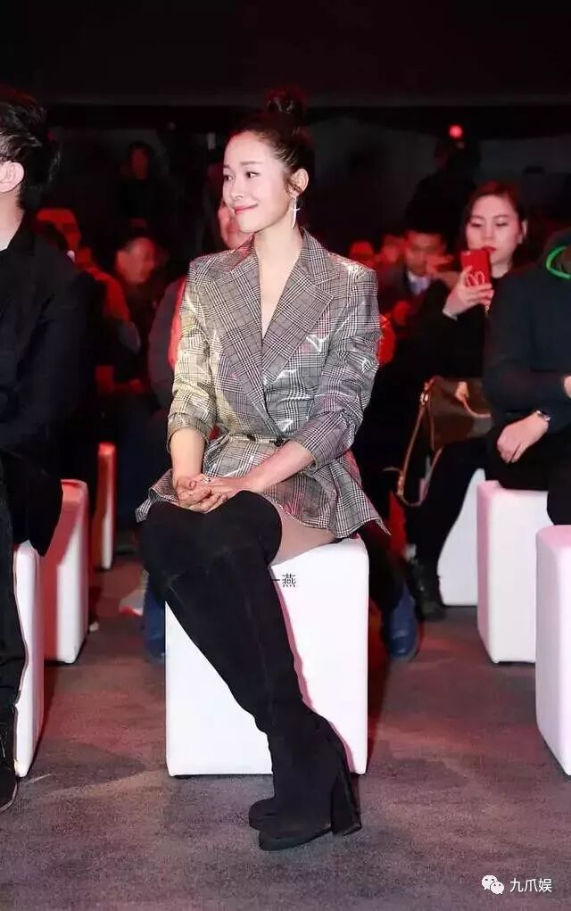江一燕身穿一款灰色格子元素的上衣,搭配一款黑色短裙,脚踩一双黑色过膝长靴,将帅气与性感完美地结合在了一起,不得不说十分会穿了。