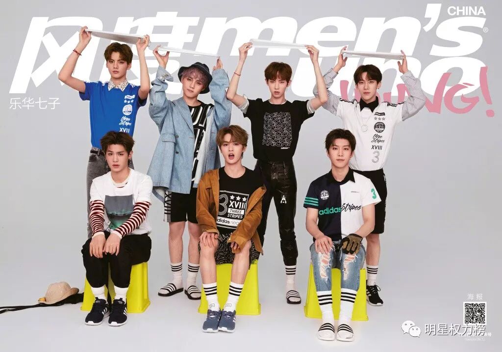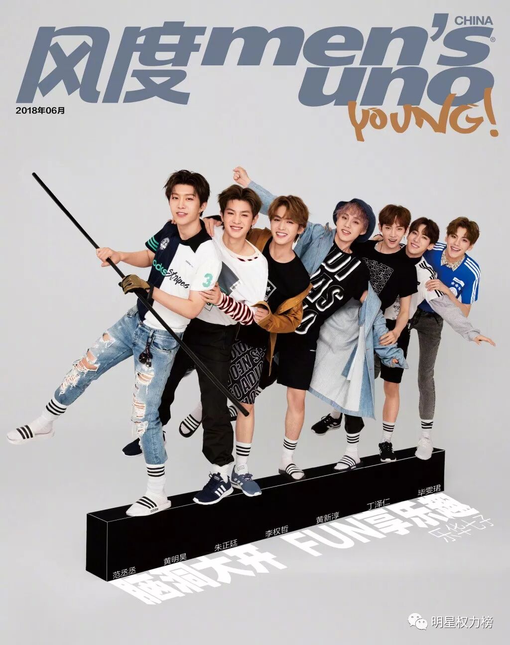 ▼ 乐华七子登上《风度men's uno Young!》2018年6月号封面,范丞丞、朱正廷、黄明昊Justin、毕雯珺、丁泽仁、李权哲、黄新淳演绎“脑洞大开 FUN享乐趣”活力运动风尚,满屏都是青春气息。