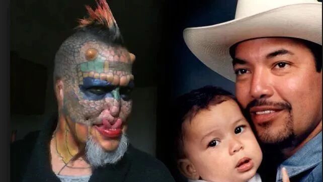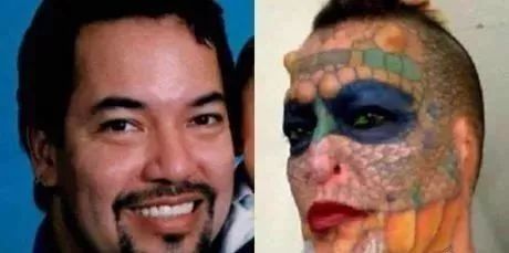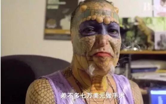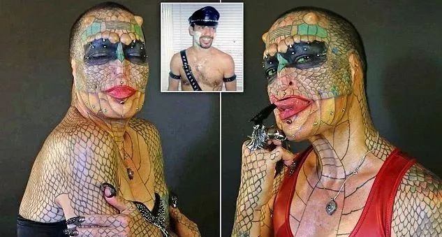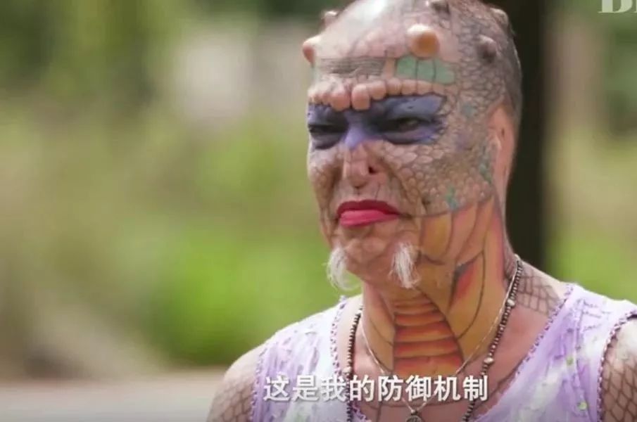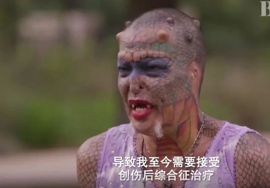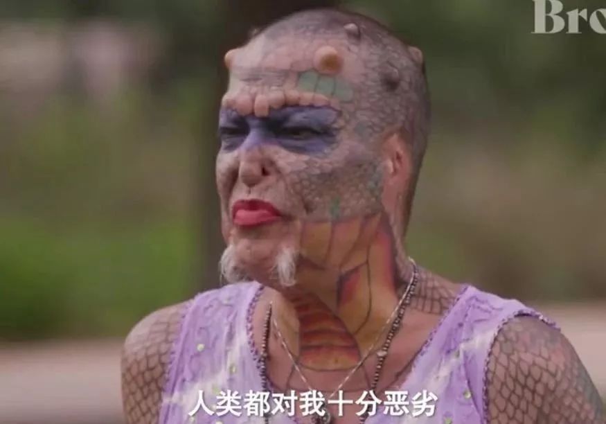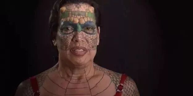 拔掉了大多数的牙,覆盖全身的恐怖纹身,割掉了外耳,切开了舌头,改造了鼻孔,头顶上植入了八个角,她变成了爬行动物,她完全成为了另一个物种。