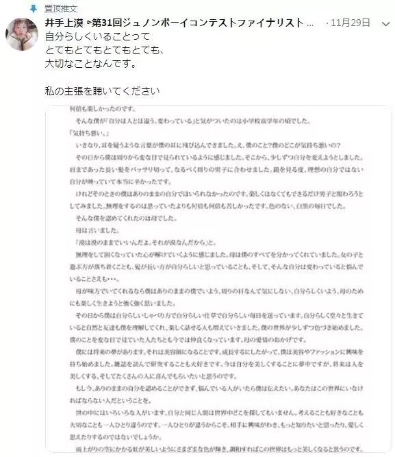 “......其实很早之前我就发现了,比起踢足球,玩女生玩的游戏会让我更开心。小学的时候我发现了自己和比人的不同,也开始有人说我恶心。