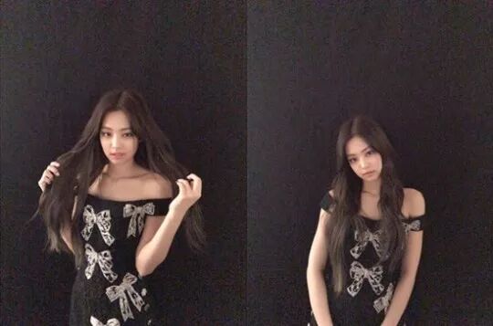 公开的照片中是身着印有大蝴蝶结的黑色连衣裙的JENNIE站在黑色的背景前凝视着镜头。