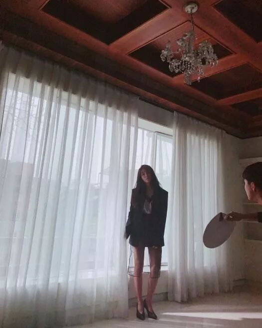 照片中郑恩地正在拍摄画报中的模样。以网纱作为点缀的服装吸引着人们的视线。特别是像恩地说的话一样看起来像有2M高的长腿使人印象深刻。