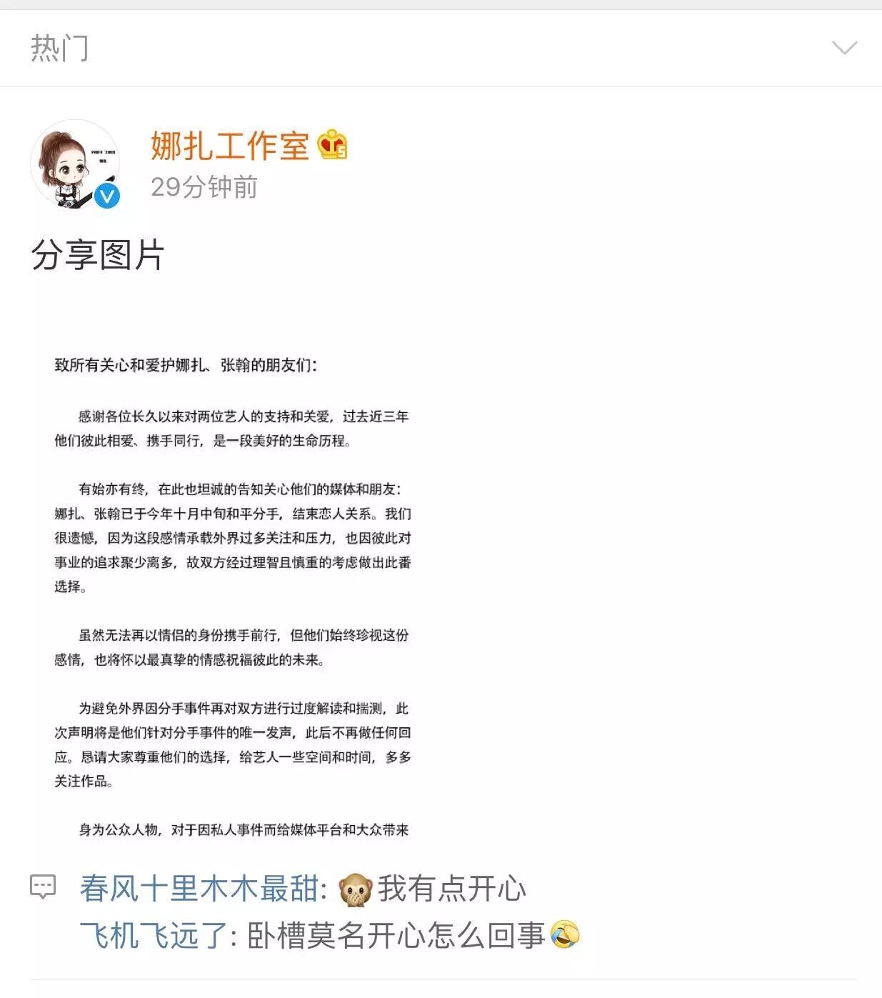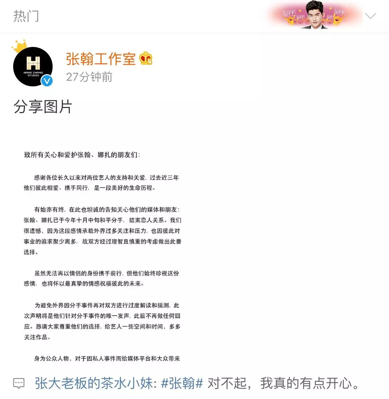 今天刚看到张翰娜扎分手消息传出还以为只是谣言,没过一会,双方都发布了工作室的声明: