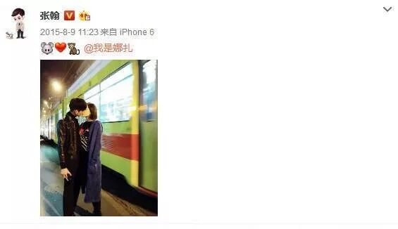 2015年8月9日,张翰以一张甜蜜吻照在微博高调公开和娜扎的恋情。