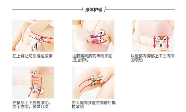 3、手臂护理:从胳膊到腋窝滚动。在腋窝的地方多按摩一下, 因为有很多淋巴的位置,多按摩一下,有利于瘦身、排毒。