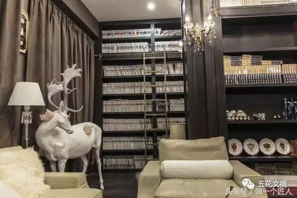 整体风格奢华复古,仔细看每个细节都在炫富,一个水晶吊灯就要40万,书桌地毯价值都超100万。