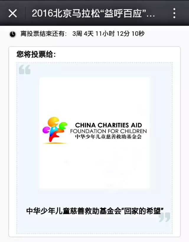 2016北京马拉松快来和许魏洲一起为“回家的希望”投票吧 回家的希望被拐儿童救助 内地男星 2016-08-10 16:58:59 264 创作不易,用心坚持,欢迎请BaGua喝几杯爱心咖啡!打赏并支持本文 打赏并删除本文 这是一场声势浩大盛况空前de马拉松大赛“益呼百应 为爱出发”公益团队“益呼百应”公益行动,首创全体参赛选手共同为公益奔跑模式。15个公益组织将依据线上投票数、选手平均完赛成绩进行综合排名。您的宝贵投票,将会帮助您支持的公益机构获得更多善款。投 票 开 始投票详情投票时间:2016年8月9日-9月5日活动规则:每人每天可投1票。组委会将于活动结束后3天公示线上投票排名结果。活动奖励:组委会将从投票活动的所有参与者中抽取300名获奖者,每位获奖者将获得 “北京马拉松36周年公益纪念邮折”一份。准备好您的爱心为回家的希望投票了是Ta!是Ta!就是Ta!中华少年儿童慈善救助基金会“回家的希望”中华少年儿童慈善救助基金会“回家的希望”项目作为15家公益组织之一,特邀请亚洲人气偶像许魏洲在此次活动中为项目代言,号召大家关注被拐儿童及儿童安全反拐宣传,邀请众位跑友为“回家的希望”而奔跑!扫描下方二维码,进入投票页面选择中华少年儿童慈善救助基金会“回家的希望”点击投票投票成功看过之后投个票呗↓↓↓ 创作不易,用心坚持,欢迎请BaGua喝几杯爱心咖啡!打赏并支持本文 打赏并删除本文 感谢您的支持鼓励,我会继续努力的!文章地址:用户邮箱:打赏金额:USDT 请输入数字点击”去打赏“,即可进行打赏支持本文章哦 许魏洲 About the Author 回家的希望被拐儿童救助 功能介绍:中华少年儿童慈善救助基金回家的希望救助项目,致力于帮助打拐被解救贫困家庭儿童回家后的生活。 Related Posts 2016北京马拉松快来和许魏洲一起为“回家的希望”投票吧 2016-08-10 16:58:59 发表评论
