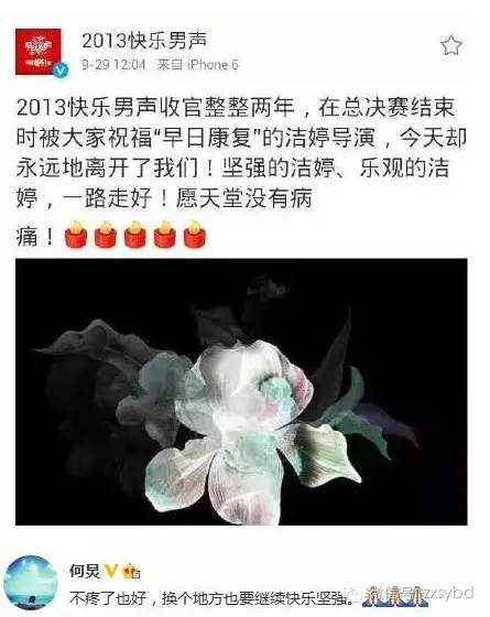 然而29日中午时分,“芒果妈妈”发微博称:“两年前,《快乐男声》让大家知道了一个导演的名字洁婷。十分钟前,洁婷永远地离开了我们!一路走好!”“坚强的洁婷、快乐的洁婷,一路走好!”