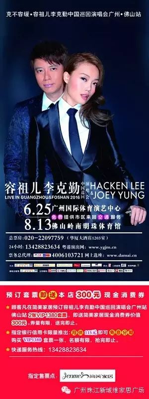 简美家居开春福利,在店内预订容祖儿李克勤中国巡回演唱会VIP套票既能欣赏一场精彩绝伦的演唱会,还能获赠简美家居现金消费券300元,最高抵用现金900元。是的您没有看错,最高可抵900元,一举两得的大福利,在这开春时节给您送礼啦。不用考虑,不用犹豫,马上行动吧,我们等待与您一起“克不容缓”。