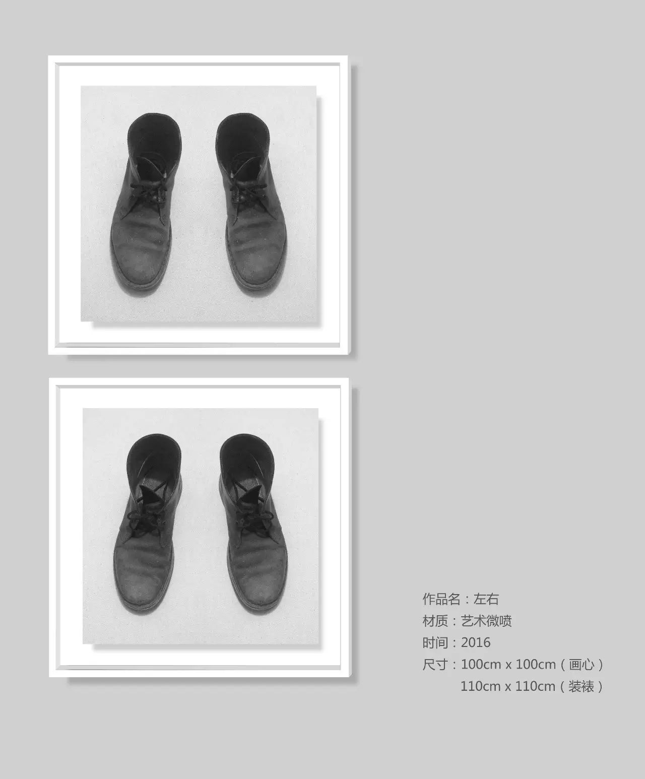 李媛媛: 2016年摄影作品《左右》,你拍摄了一双鞋中的一只左脚,通过镜像的方式一而再的反转,最终构成2双完整的鞋子的画面,我觉得这个作品特别有趣,你思考的线索是什么呢?