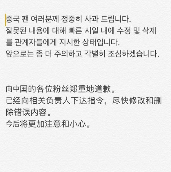 10月11日下午,YG娱乐会长梁铉锡通过个人社交平台公开了道歉文。“向中国的各位粉丝郑重地道歉。已经向相关负责人下达指令,尽快修改和删除错误内容。今后将更加注意和小心。 ”