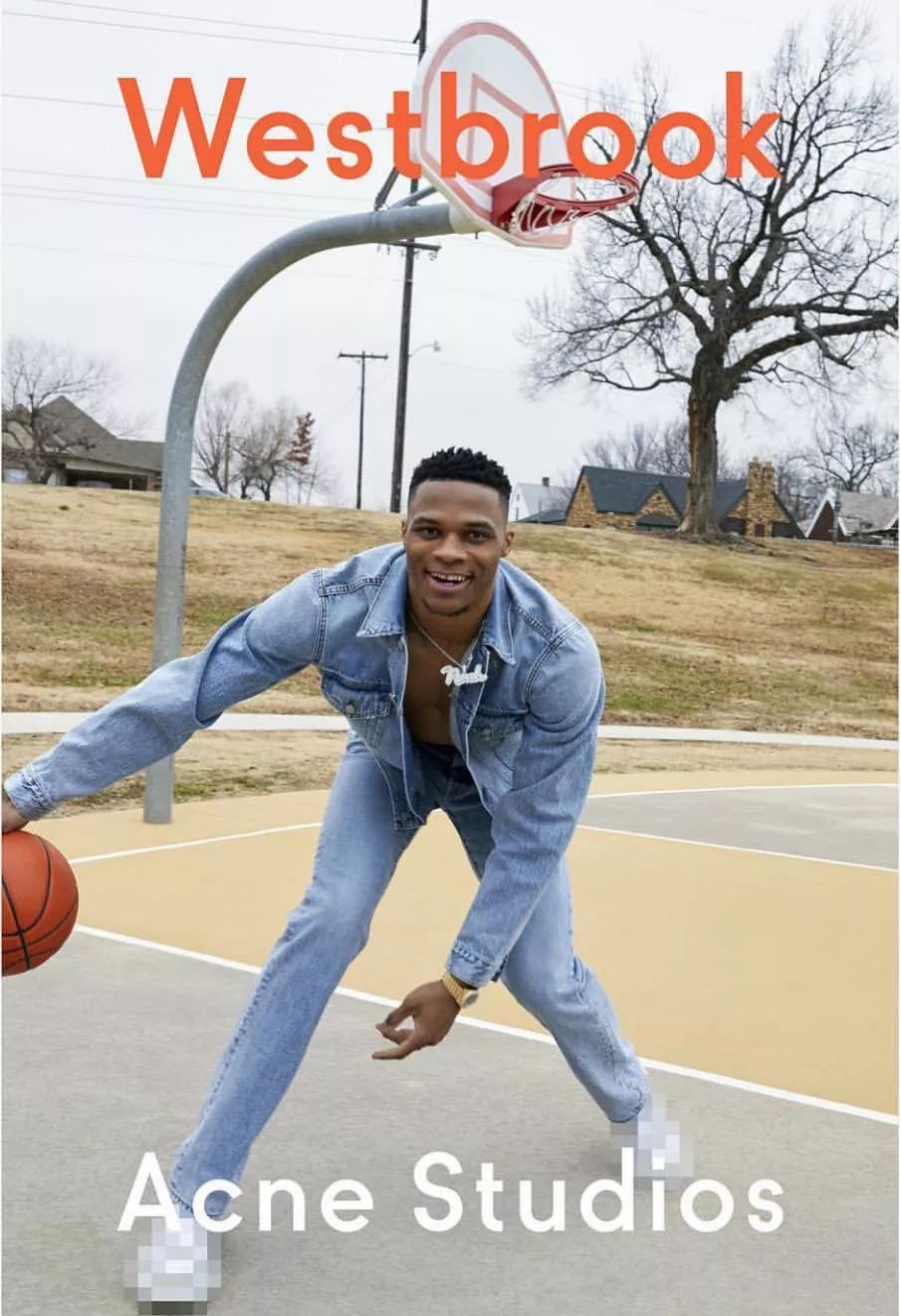 随后又晒出威少的运球照片,并为鞋打上了马赛克,配文表示威少上脚了一双还不能曝光的 Acne Studios 新款鞋型。